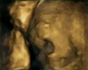 One". Reißt ein Kind auf einem Ultraschallbild den Mund weit auf,